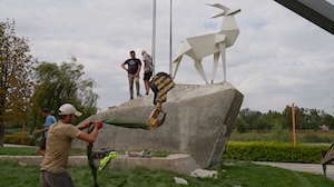 Security Guarantees is an exhibition by Zhanna Kadyrova, curated by Ksenia Malykh and Leonid Marushchak, and commissioned by Tetyana Berezhna, Deputy Prime Minister for Humanitarian Policy of Ukraine — Minister of Culture of Ukraine. The Ukrainian Pavilion’s project raises the issue of unfulfilled security guarantees, for which Ukraine gave up its nuclear arsenal in 1996. In 1994, three years after gaining independence, Ukraine joined the Treaty on the Non-Proliferation of Nuclear Weapons and relinquished its nuclear arsenal in exchange for security assurances from the United States, the United Kingdom, and the Russian Federation. These states, along with Ukraine, became signatories to the Budapest Memorandum, which recognised Ukraine's territorial integrity and committed the other three parties not only to refrain from threatening Ukraine, but to seek its protection should a threat arise. The core of the exhibition is Zhanna Kadyrova's sculpture, The Origami Deer. In 2019, this sculpture was installed in Yuvileynyi (Jubilee) Park in Pokrovsk, Donetsk Oblast. On the same site, a dismantled Soviet nuclear-capable jet once stood. The sculpture was cast on a pedestal and was not designed for further transportation. However, in 2024, as the front line approached the city, Zhanna travelled to Pokrovsk with the NGO Museum Open for Renovation, and, together with a group of specialists and municipal workers from Pokrovsk, evacuated the sculpture.